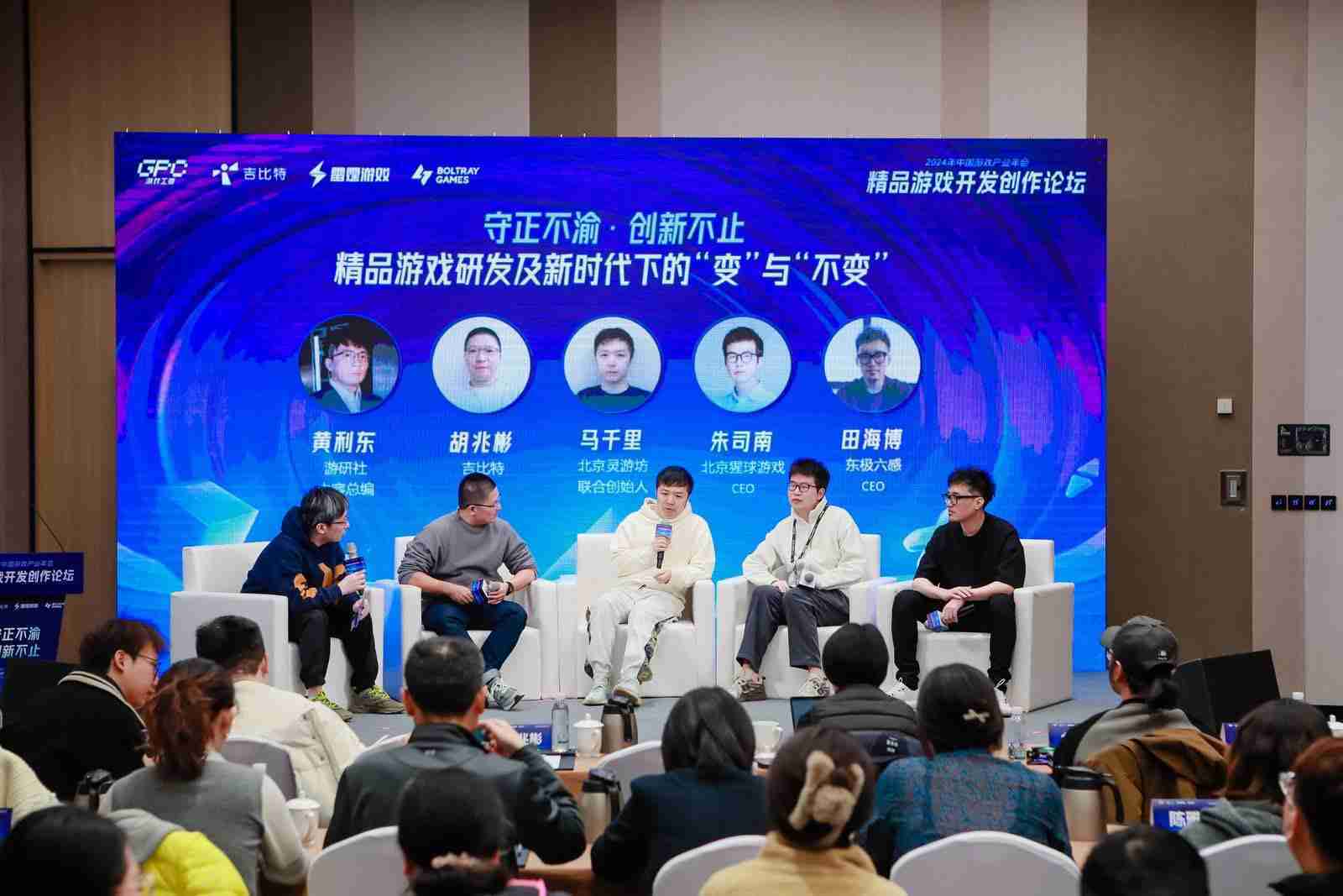 圆桌对话环节,,,,在游研社内容总编黄利东的主持下,,,J9.COMCTO胡兆彬、、、北京灵游坊联合创始人马千里、、北京猩球游戏CEO朱司南、、、东极六感CEO田海博等四位嘉宾围绕“守正不渝、、创新不止——精品游戏研发及新时代下的‘变’与‘不变’”这一主题分享了各自在精品游戏开发理念及工程能力搭建方面的见解和经历,,,并就行业变化下游戏人需要坚守的理念等展开交流探讨。。。