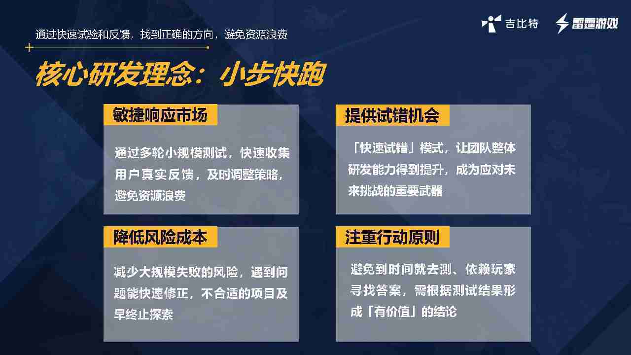 从目前的实践来看,,,内容向确实不合适,,,因为小步快跑更适合做玩法的尝试,,,,但是如果是内容项,,,玩法已经确定的,,这时候应该做切片,,,而不是做小步快跑的方式,,,,因为做切片的成本是很高的。。我们有过两个项目,,,,要花很长时间做切片的内容,,,而切片内容只占整个项目的1/10,,,但要花的时间成本、、、人力成本、、、、经济成本可能会到1/3,,所以用很短的时间做游戏的原型,,,验证其好不好玩,,,,是想尝试在粗糙表达的情况下,,,看看能否获得非常好的留存表现。。。。如果留存表现非常好,,,证明游戏内容体验是比较准确和非常好的内核,,,我们会尝试加外围内容的拓展。。。