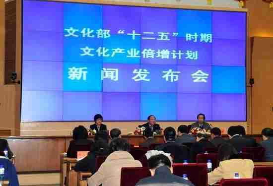 2月28日下午,,,,文化部在京召开新闻发布会,,正式向社会发布《文化部“十二五”时期文化产业倍增计划》,,,提出了 “十二五”期间文化部门管理的文化产业增加值年平均现价增长速度高于20%,,,,2015年比2010年至少翻一番,,实现倍增的奋斗目标。。。。